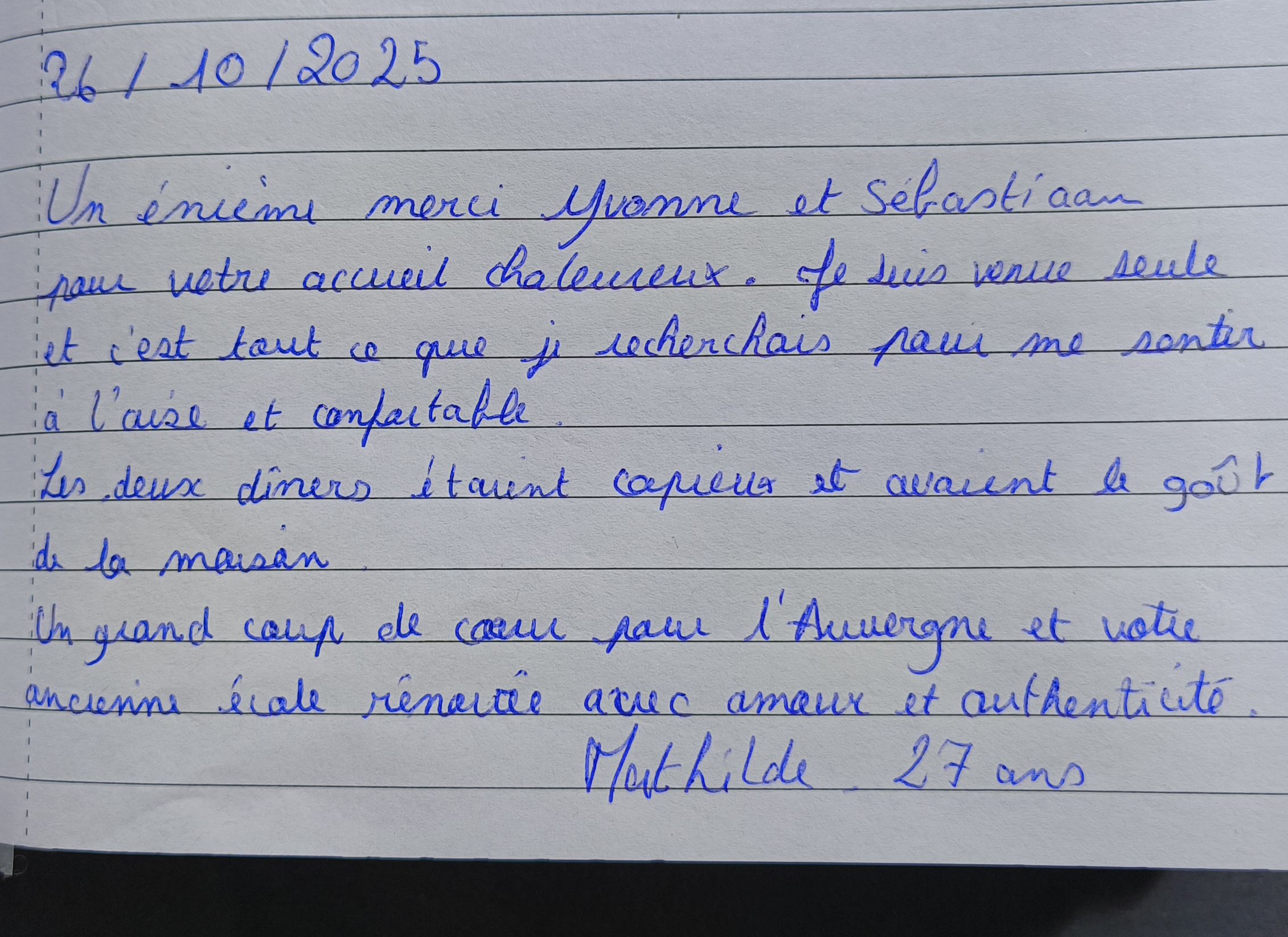 In het hart van het groene, heuvelachtige landschap van de Auvergne, verwelkomen wij u graag in onze sfeervolle chambre d’hôte in Bertignat (15 minuten vanaf Ambert). Ons kleinschalige gastenverblijf is gevestigd in een voormalige dorpsschool, waar de nostalgie van vroeger hand in hand gaat met modern comfort.